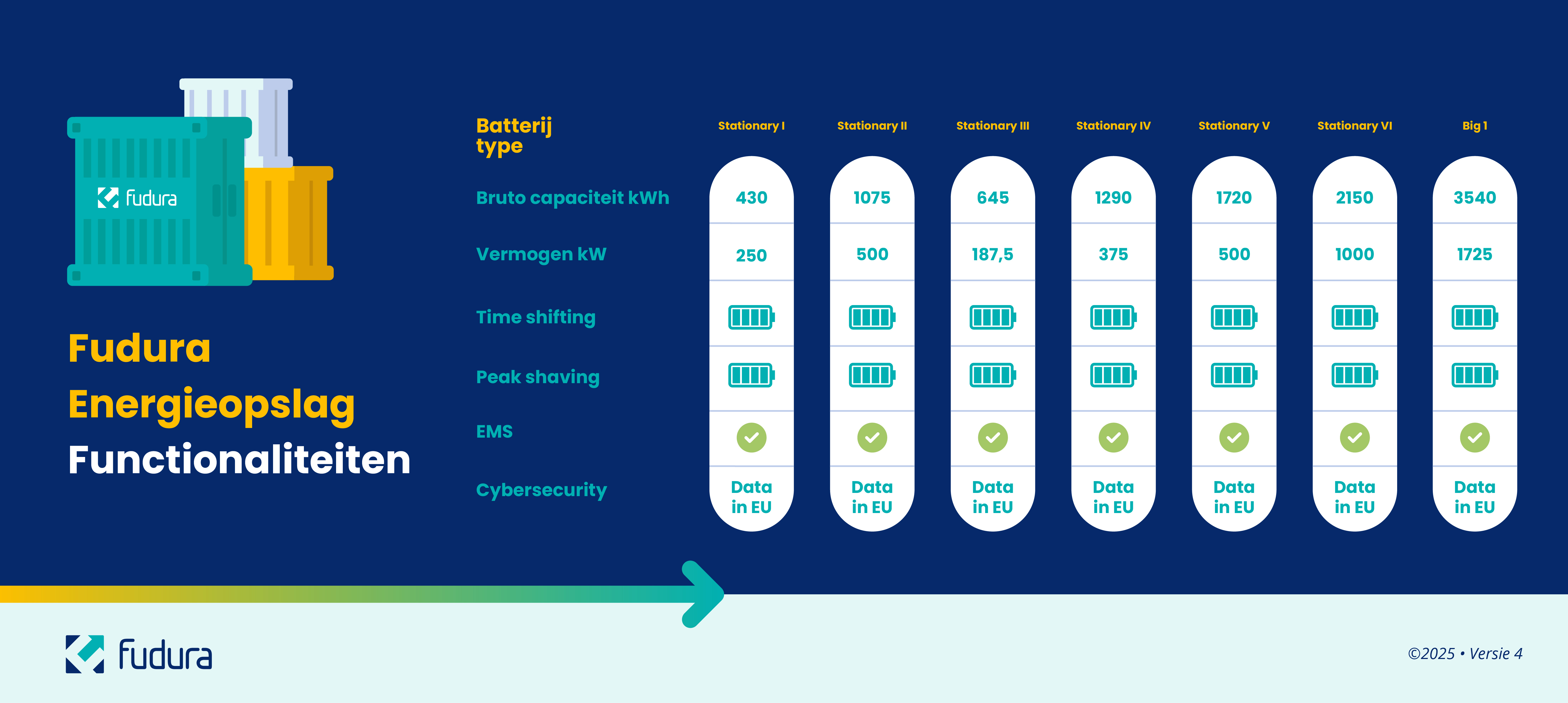 Energieopslag biedt bedrijven flexibiliteit en zekerheid, vooral in tijden waarin het stroomnet steeds voller raakt. Batterijen zorgen ervoor dat je energie kunt inzetten wanneer jij het nodig hebt, ook tijdens piekmomenten. Met de slimme energieoplossingen van Fudura ben je klaar voor de toekomst.